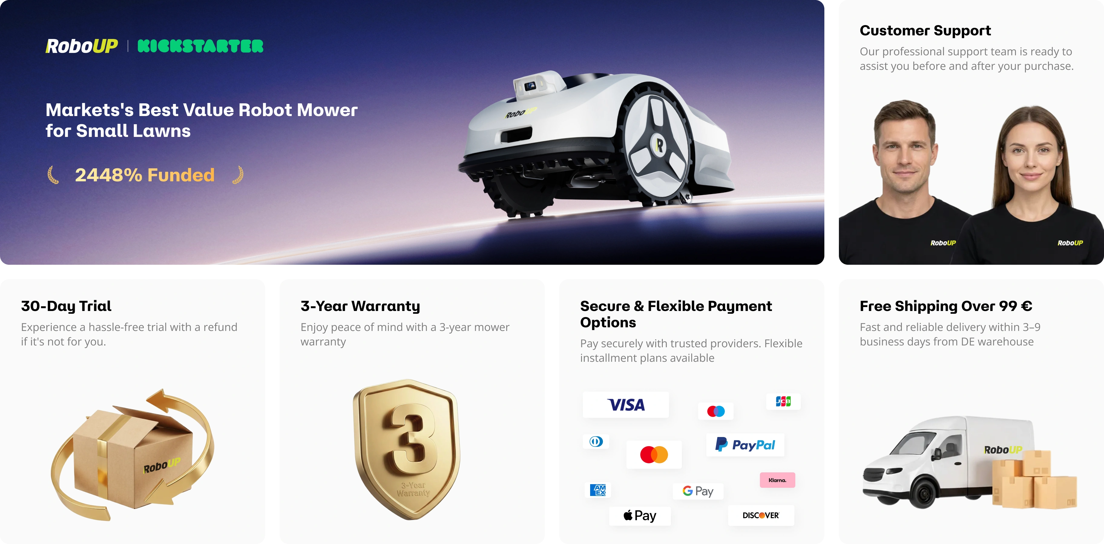 Mein Garten ist uneben und hat Hanglage – zusammen mit meinen Haustieren war Rasenmähen früher echt mühsam. Der RoboUP macht es mir jetzt leicht: Die Einrichtung war fix erledigt, und dank der smarten App-Steuerung und der zuverlässigen Hinderniserkennung für meine Tiere kann ich mein Wochenende endlich wieder genießen.