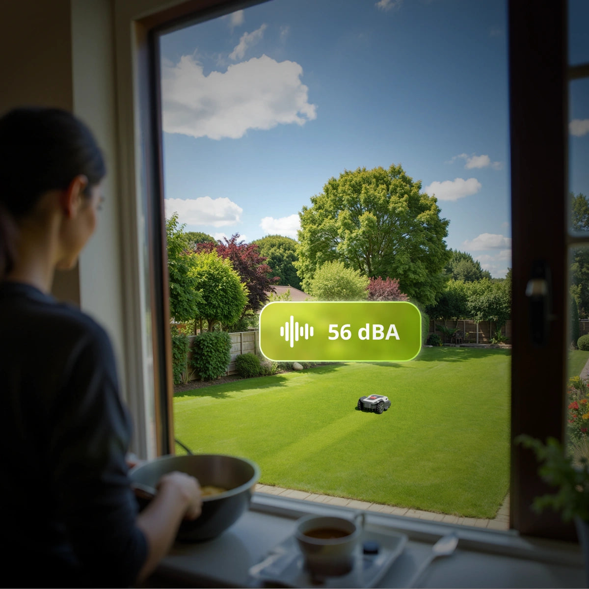 Arbeitet bei nur 56 dB – leiser als ein normales Gespräch – und erzeugt null Emissionen für einen sauberen, umweltfreundlichen Rasen.